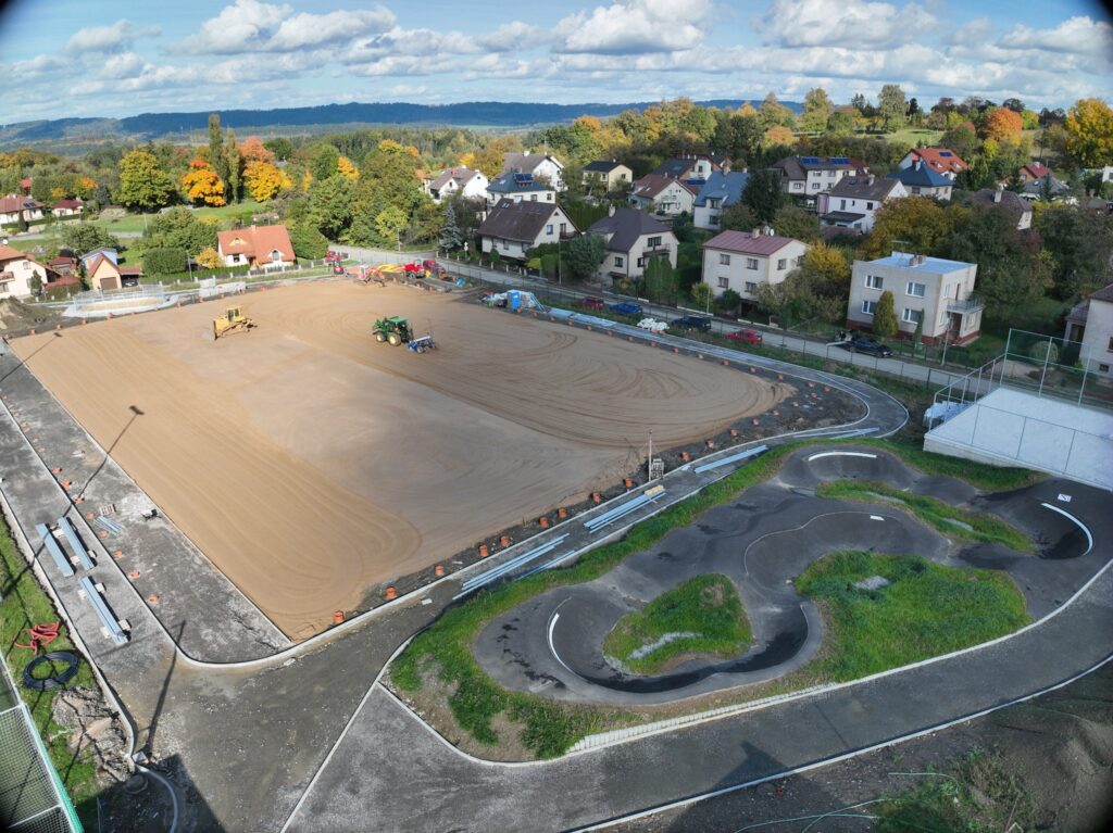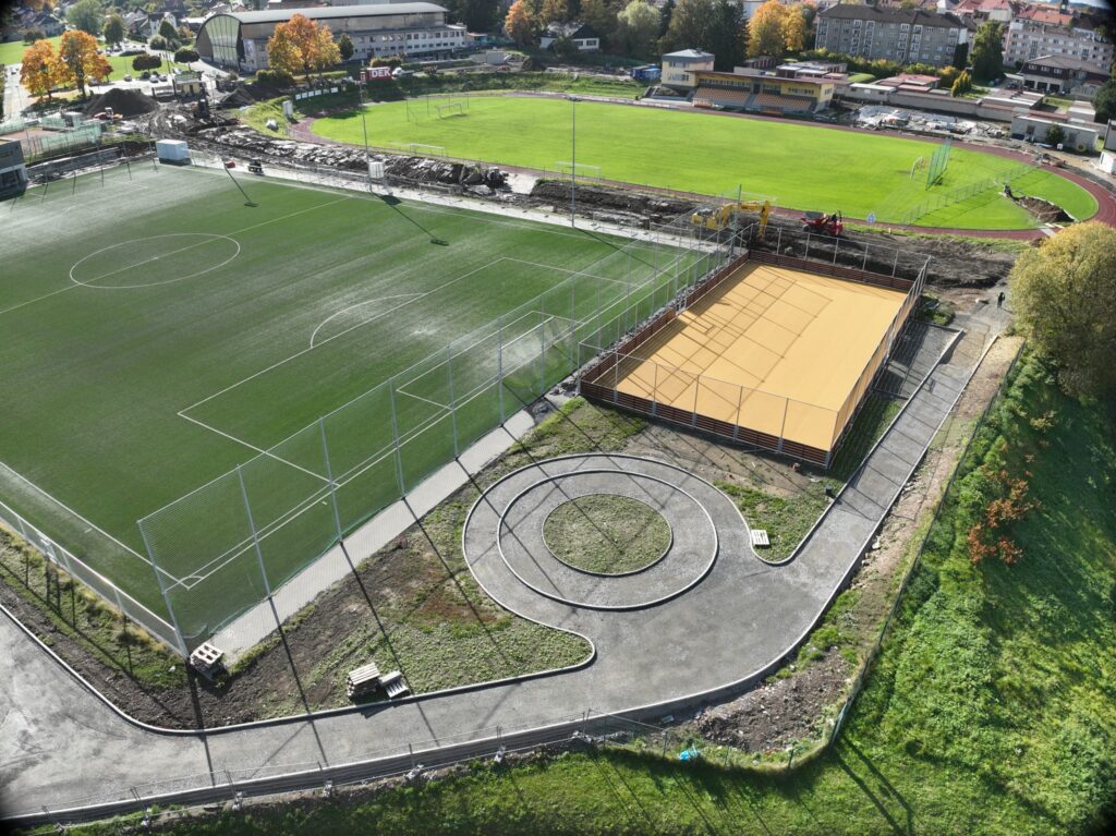 Stavba zahrnuje kompletní rekonstrukci celého areálu a je rozdělena do následujících stavebních objektů: in-line stezka, kiosek, hřiště na petanque, amfiteátr, parkour, dětské hřiště, areálová komunikace, tribuna, integrovaná buňka, přístřešek, rozšíření volejbalového hřiště, beachvolejbalové hřiště, pumptrack, travnaté fotbalové hřiště, tréninková aréna, víceúčelové hřiště, reklamní plochy, skatepark, část nového oplocení, parkování v ulici Sportovní a sadové úpravy.